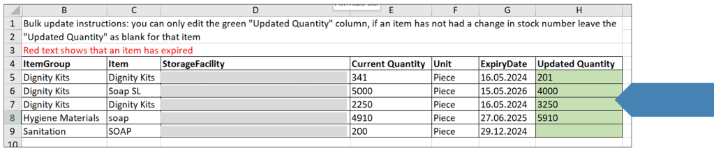 If the quantity of an Item does not need an update, you can leave the corresponding cell in the green column blank.