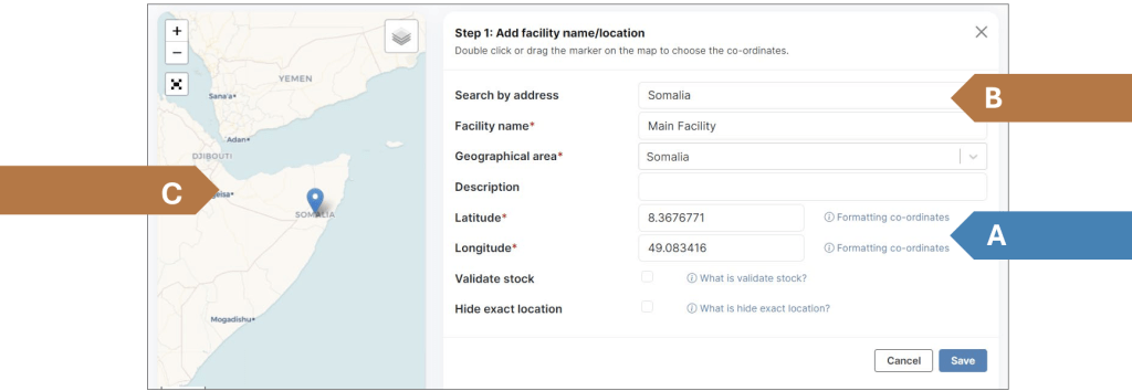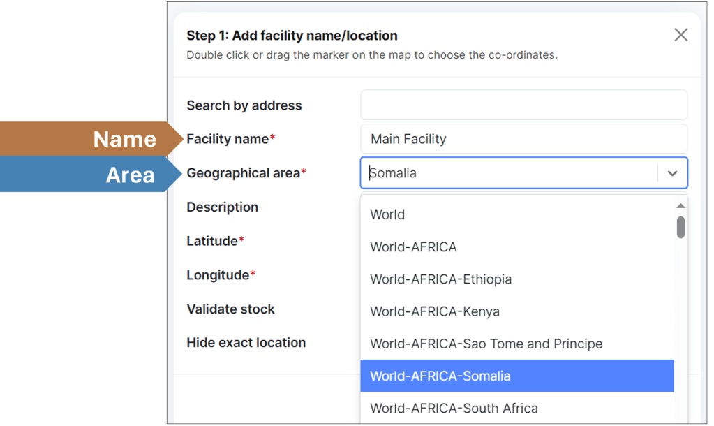 In the example below, we have given the name ‘Main Facility’ and chosen the Geographical Area ‘World-Africa-Somalia’.